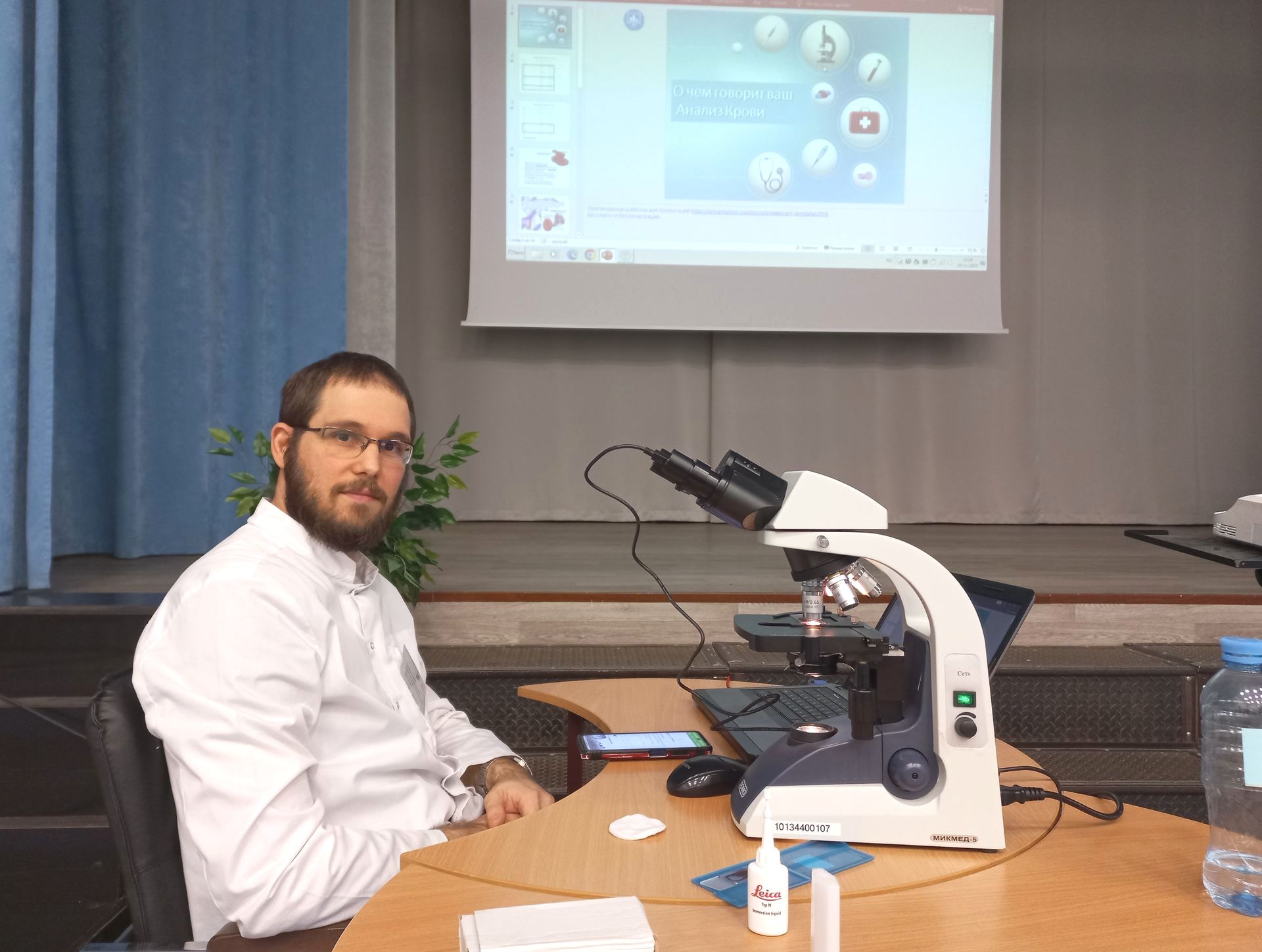 Школьники увидели на большом экране, как выглядит окрашенная для исследования и неокрашенная капля крови под микроскопом. Вместе с ученым школьники смогли рассмотреть в окрашенном препарате крови эритроциты, лейкоциты и тромбоциты. Во время и после лекции ученому задали много вопросов, на которые он с удовольствием ответил.