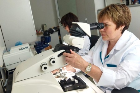 Научные сотрудники лаборатории ультраструктурных исследований НИИКЭЛ – филиал ИЦиГ СО РАН изучают ткани древнего мамонта, найденного на острове в Северном Ледовитом океане. Образцы тканей животного доставили в Новосибирск из Якутии.