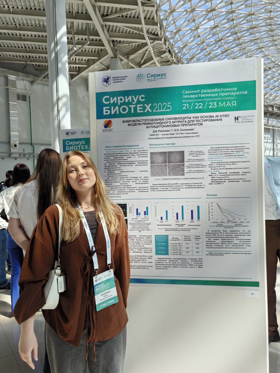 Руководитель лаборатории фармакологических активных соединений, к. б. н. Анастасия Соловьева представила постерный доклад на тему «Регуляция воспалительного фенотипа фибробластоподобных синовиоцитов при ревматоидном артрите с использованием направленного блокирования ФНОα ДНК-аптамерами». Лаборант-исследователь Дарья Риппинен подготовила постерный доклад «Фибробластоподобные синовиоциты как основа in vitro модели ревматоидного артрита для тестирования антицитокиновых препаратов».