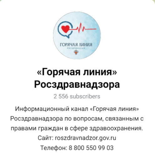![]() | ![]() | Информационный телеграм-канал "Горячая линия" Росздравнадзора Для перехода в канал наведите сканером телефона на QR-код "Горячая линия" Росздравнадзорапринимает обращения по вопросам: - защиты прав граждан в сфере здравоохранения, участвующих в специальной военной операции; - по вопросам получения обезболивающих препаратов и противоопухолевой терапии; - по вопросам получения льготных лекарственных препаратов; - по вопросам отсутствия лекарственных препаратов в аптечных сетях; - по вопросам, связанным с работой Фонда «Круг Добра». |