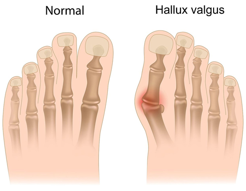 Когда расхождение плюсневых костей чрезмерно, первая плюсневая кость, к которой прикрепляется большой палец, сильно отклоняется, сухожилие, которое проходило вдоль, вслед за отклоненной плюсневой костью меняет направление и начинает тянуть палец наружу. В результате смещается и выпирает головка плюсневой кости. Отклонение большого пальца кнаружи называет hallux valgus.